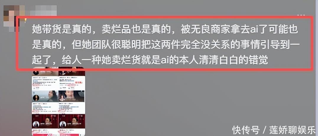而且根据一部分网友的反应啊,她带的货也实在是把明星效应拉满了,价钱其实也不算便宜,而且带的商品往往也被反映是残次品,这本质上确实是,她直播带货的商品需要进一步提升的原因吧,而又结合到在最近的事件啊,就导致了不少的网友认为,ai成了她的白手套、遮羞布了!