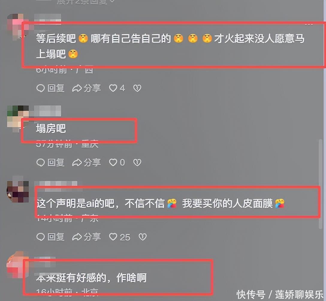 然而她的回应也相当的让这部分网友失望,就是直接发文控告上报,这无疑是在这部分网友的雷区上跳舞了。12日,这件事进一步发酵,表示都是水军在造孽,将以上网友的言论打为了ai造谣,要进小黑屋的!